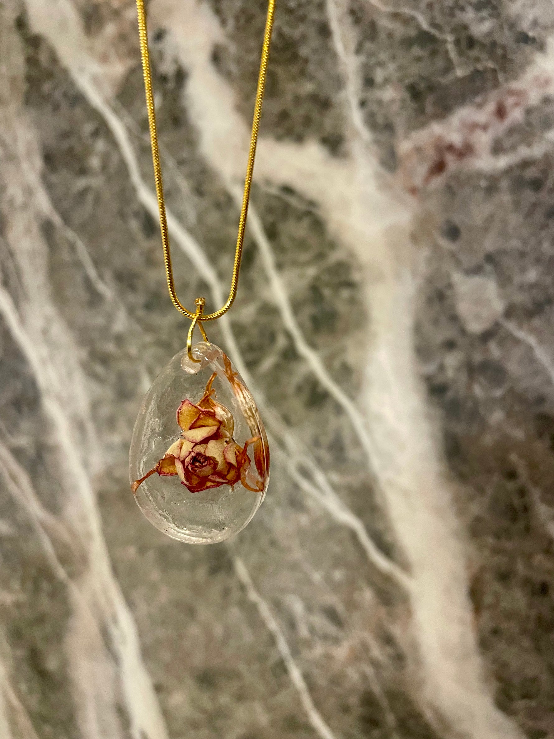 This elegant necklace features a real dried rosebud captured in a teardrop of crystal clear resin. The pendant is suspended from a fine 18K gold-plated stainless steel chain, offering both durability and softness.