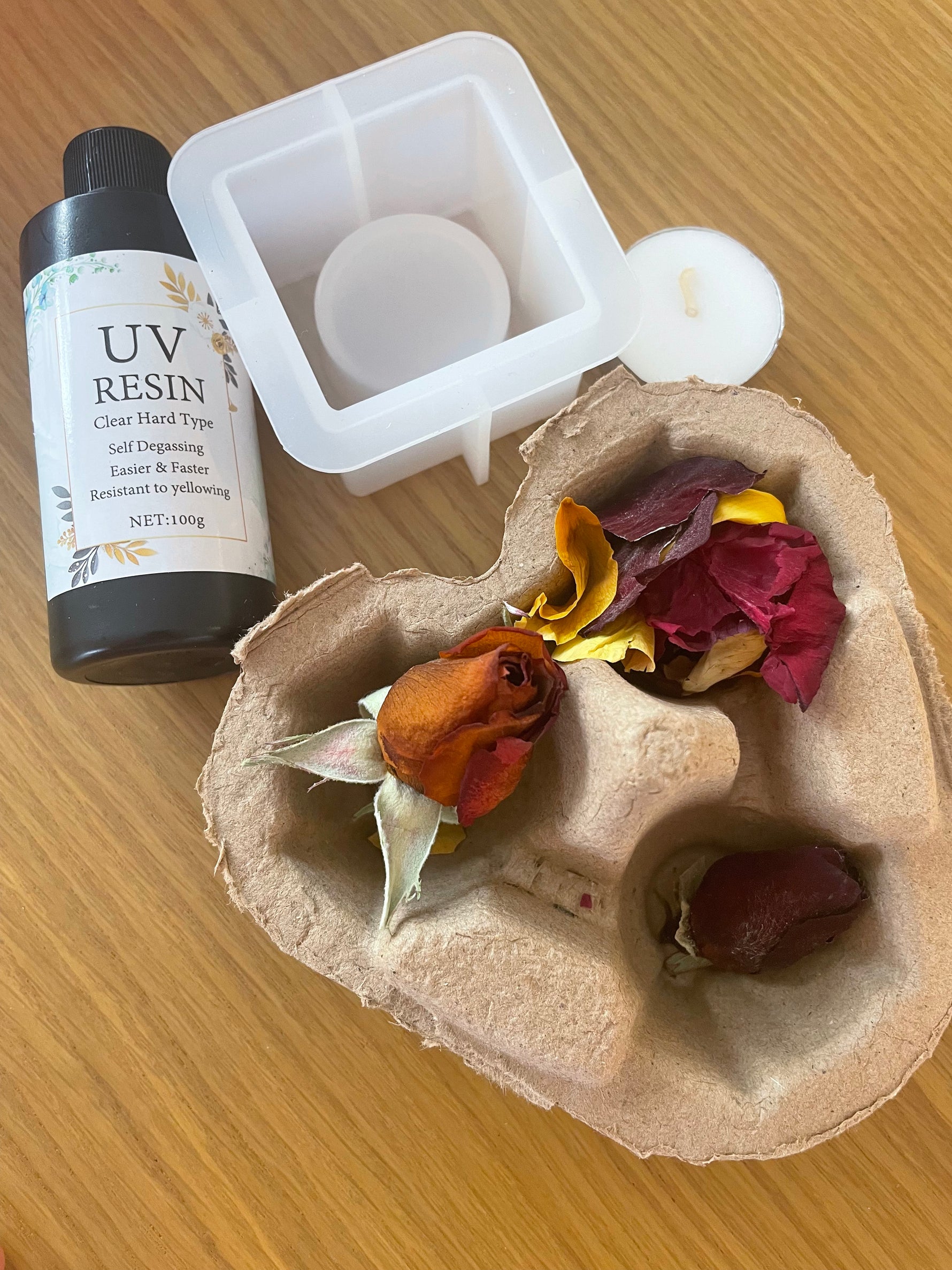 Create your own rose infused epoxy tea light. A glowing blend of preserved rose buds, petals, and crystal clear resin. This craft kit includes all the materials you need to pour and cure your very own botanical light.